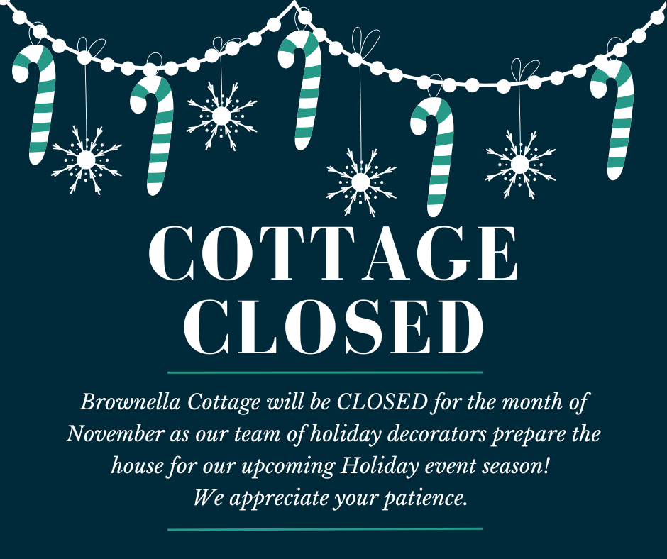 Brownella Cottage will be closed for the month of November as our team of holiday decorators prepares for the Holiday event season! Thank you to our talented decorators who give of their time to make Brownella shine for holidays! The Cottage will re-open on Saturday, December 6th for our Annual Holiday Open House from 1:00-4:00 p.m.!