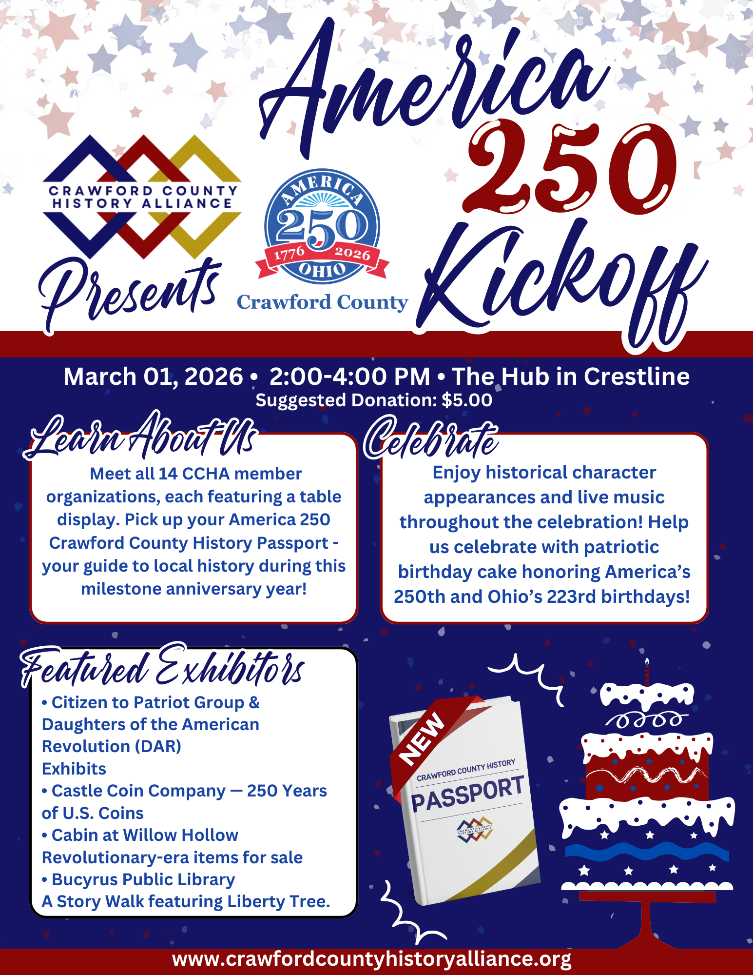 Join the Crawford County History Alliance as we launch America 250 with a county-wide kickoff celebration honoring the 250th anniversary of the United States and Ohio’s 223rd birthday!